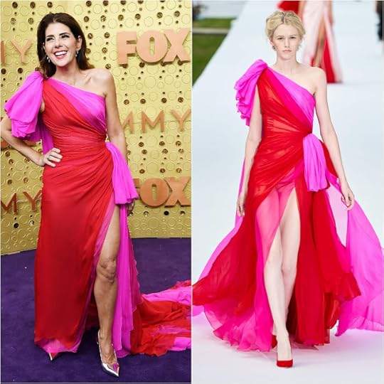 Marisa Tomei in Ralph & Russo Couture Fall/Winter 2019--Marisa Tomei wore that pink-and-red color combination that we saw several examples of at Sunday's Emmys red carpet. Tomei's one-shoulder dress was from UK design duo Ralph & Russo and their Couture collection for Fall/Winter 2019. The silk chiffon gown had a beautifully draped top section with bow-tied details at the shoulder and waist and featured a super sexy high side slit.