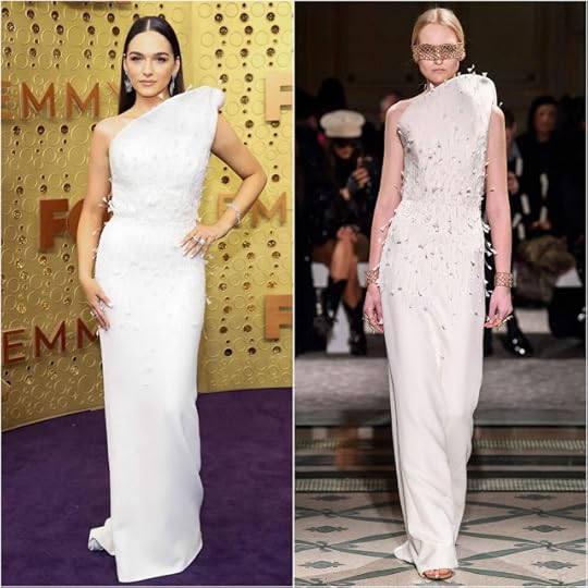 Emanuela Postacchini in Antonio Grimaldi Couture Spring/Summer 2019--Italian actress of "Who Is America?" and "The Alienist" got my attention with this dramatic and sculptural ivory column gown she wore at the 2019 Emmy Awards. The silk crepe gown with feathered applique--from Italian couturier Antonio Grimaldi and his Spring/Summer 2019 Couture collection--had a simple column shape but it was all about that shark fin-like neckline that framed her face beautifully; so very Alta Moda! Bellissima!