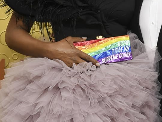 The Rainbow Clutch--Cox used the Emmys to make a political statement with this Rainbow clutch designed by Laverne highlighting LGBTQ rights and Title VII. On October 8th, the Supreme Court will hear a case of whether LGBTQ workers are protected by the Title VII of the Civil Rights Act of 1964, a law that "prohibits employment discrimination based on race, color, religion, sex, and national origin".