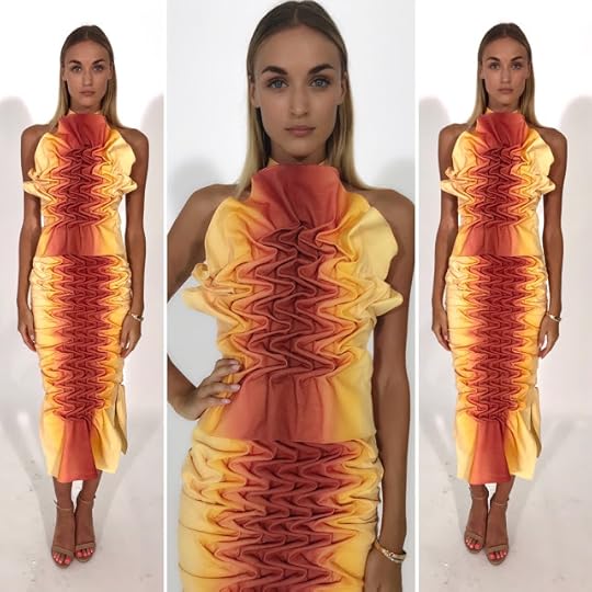 Twill Look--Model in FIDM Supima Finalist Illene Martoseno's ombre dyed/fabric manipulated halter-neck fitted dress--Pier 59 Studios, Chelsea Piers NYC