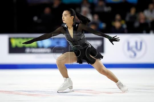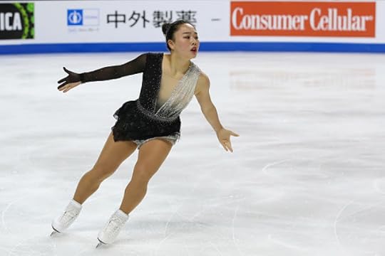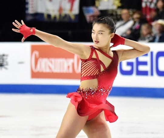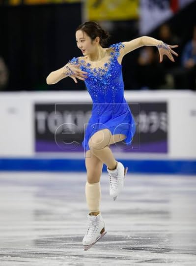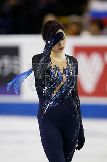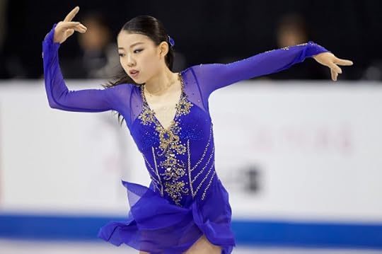 Rika Kihira Japan Short Program--For her Short program to Breakfast in Baghdad by Ulf Wakenius performed by Youn Sun Nah, Japan's Rika Kihira wore this royal blue costume featuring gold applique and silver rhinestones. The design had Middle East inspirations with the embroidery and flouncy extra long sleeves, evoking an exotic Sheikha perhaps. I liked the bold color and how the sequin work on the torso mirrored the construction work of an actual corset/bustier. I also thought it was refreshing to see her loose ponytail as the hairstyle choice as opposed to the typical figure skating lady perfect chignon-like bun.