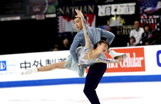 Cheng Peng and Yang Jin China Free Skate--China's Pairs team skated their Free Skate to Cloud Atlas (soundtrack) wearing these pretty costumes. The varying shades of blue were beautiful and while I liked his "different" vest/jacket with rhinestone trim, it was Cheng Peng who was the obvious costume STAR! Her dress featured a pale blue chiffon base with deep lilac and silver paillettes and sequined applique, along with a silver sequin "belt".