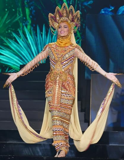 Miss Grand Belarus Karina Kiseleva--This is straight-up "Lion King" Gown Madness. The feathers, the nude vs. solid paneling, the sequins...why are there crystals on her shoulders and draped down her back??? And then, she thinks it's fine to wear a diamante necklace to finish it all off. And then (Part 2), her hair!!! It's like she's going to Happy Hour after work.