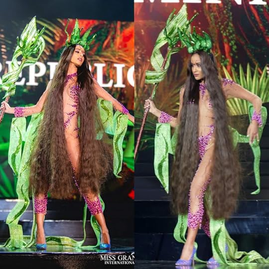 Miss Grand Italy Mirea Sorrentino--Looks like someone is ready for a Gay Parade! Part of me loves this (the Gay Parade part) but then, I clear my eyes and realize that yes, this is like 100 tiers of gathered tulle ruffles, there's a side front opening and then nude/black sequined lace top, and she's got a top bun that will withstand a nuclear war. Wow. Maybe this might work at, say, a Eurovision contest.
