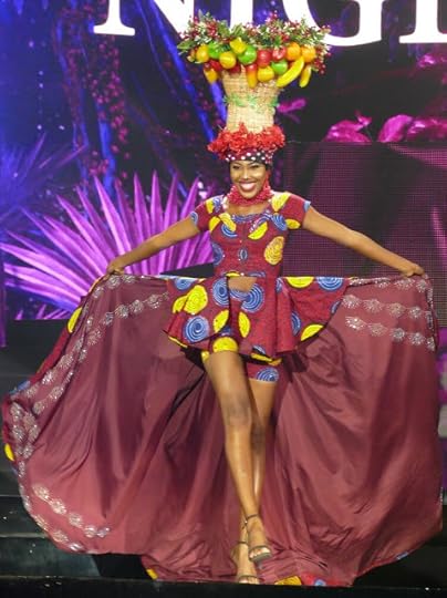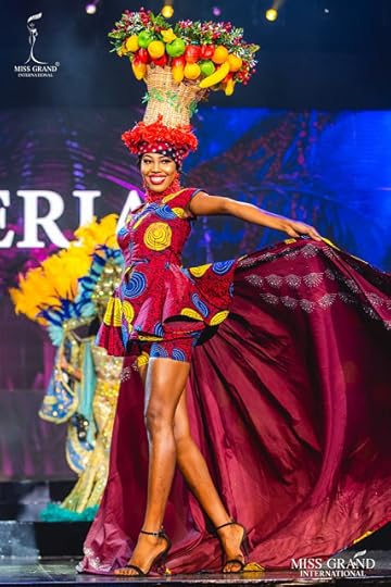 Miss Grand Nigeria Ocheche Favour--Lastly, I wanted to discuss the lovely Ocheche Favour, Miss Grand Nigeria. This purple gown was a bit confusing. There's the sequined asymmetrical base, the satin back skirt, the nude illusion backing....it was a lot. But more distressing was the placement of the sequins ON THE BUST. One word: No. Oh and yes, then there are those blush pink heels. Oh Dear!