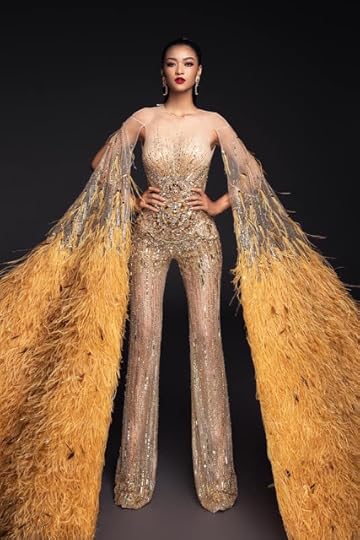5. Miss Grand Vietnam Nguyen Ha Kieu Loan--Miss Grand Vietnam triumphed the Evening Gown Preliminaries with wearing the only jumpsuit "gown". And I loved it! It was designed by Do Long and featured a stunning golden/nude sequined jumpsuit with hand-applied yellow feathered exaggerated sleeves. It was dramatic, stage-worthy and fashion unique! When she appeared on stage, all I could say was "You Go Girl!".