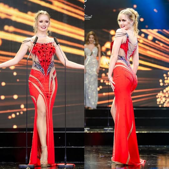 4. Miss Grand Mexico Maria Malo--If I have to be honest, Maria was probably my favorite to take the top crown, but I get it, the pageant was in Venezuela and that country's contestant was gorgeous and well, it was their night! But moving on...Maria wore the strapless lilac-colored sequined gown in the top photo. I liked its Old Hollywood Glamour simplicity and especially the lovely side drape. But then, for the Finals, she changed to another lilac-colored sequined gown (above photos) which I REALLY LIKED! The column shape fit her well, making her look TEN FEET TALL, and as a Fashionista, I really appreciated the unique sleeve. Muy Bien!