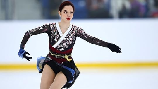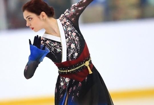 Free Skate to Memoirs of a Geisha (soundtrack) by John Williams--For her Free Skate, Evgenia wore this. It was STUNNING! I loved everything about this costume. This was Skating Couture on another level! I loved the kimono-like silhouette, the white neckband, the gorgeous sequin applique, the extra-long sleeves and last but not least, the red Obi with gold waist-tie. And that deep-red lipstick: Wow. Just gorgeous. I bow down to whoever designed it and made it.