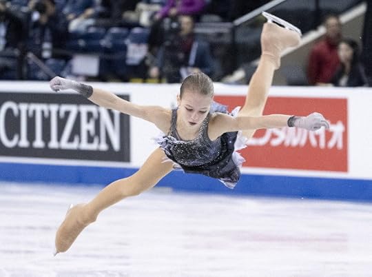 Alexandra Trusova Russia Short Program--Skating her Short Program to Solveig's Song (from "Peer Gynt") by Edvard Grieg performed by Meav; In the Hall of the Mountain King (from "Peer Gynt") by Edvard Grieg, this very young (15 years old) Russian wore this costume above. The design began innocently enough, with a tie-dye light lilac look with raw/pointed edges/hems and some "hints" of dark coloring. But then...