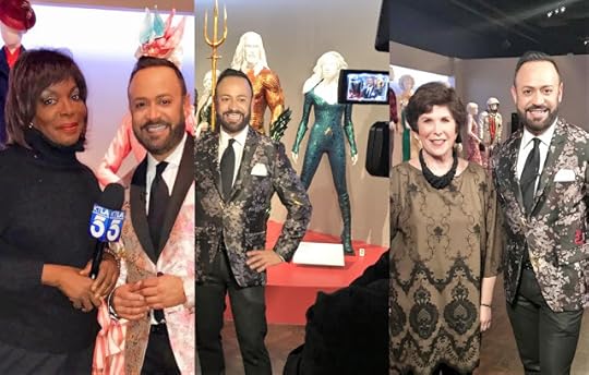 Nick Verreos filming TV Press Segments for FIDM Museum's 27th Art of Motion Picture Costume Design Exhibition--(L to R) Nick Verreos with KTLA's Gayle Anderson, Nick Verreos filming with EBC Taiwan, and Nick Verreos with Adrienne Alpert of ABC-7 LA
