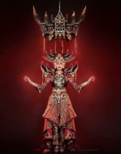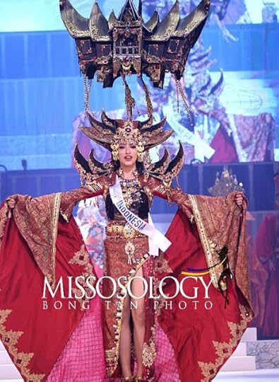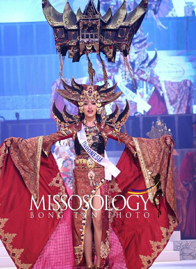 3. Miss Indonesia International Vania Fitryanti Herlambang--Designed by Jember Fashion Carnaval--an Indonesian costume design company--this costume depicts the Rumah Gadang (means "Big House"), a traditional home in the West Sumatra Province.The black, red and gold are colors of Marawa Minangkabau, symbolizing intellectual, braveness, and grace of Minang people. I thought this was a very impressive costume combining traditional aspects of Indonesian culture with a little bit of high fashion, with its luxe silk fabrication and dramatic pagoda-like shoulders and overskirt/cape.