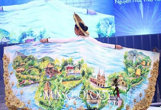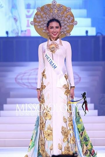1. Miss Vietnam International Nguyen Thuc Thuy Tien--This was my No. 1 Choice for Best National Costume at the Miss International 2018 Beauty Pageant. I loved the Haute Couture take on the traditional Vietnamese Ao Dai; this one was simply outstanding! The dress itself was fitted to perfection and featured golden flower appliques rising from the hem. The same gold embroidery was then seen in a stunning hand painted cape depicting Vietnamese countryside scenes.And if all of that wasn't enough, the entire look was finished off with a gorgeous straw and crystal headdress/hat. Kudos to the designer for a fabulous National Costume!
