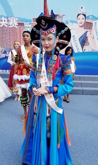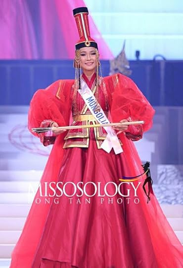 Miss World Mongolia Erdenebaatar Enkhriimaa--I loved this costume for the colors, dramatic headdress and overall beauty. The blue, orange, green and red colors as well as traditional Mongolian textile prints, sequin details, texture, beauty and overall strong National costume impact.