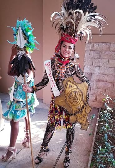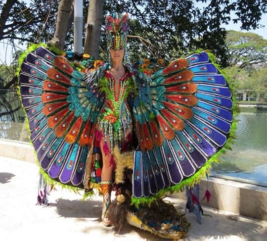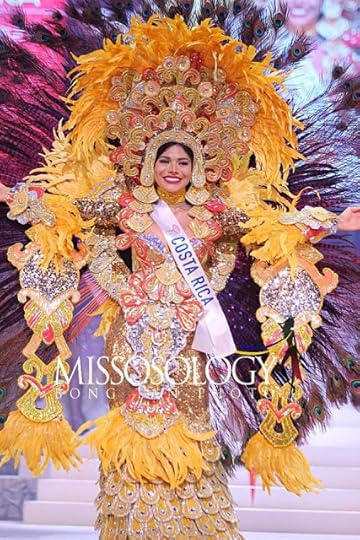 5. Miss Costa Rica International Glennys Medina Segura--Another great example of a Pre-Columbian costume was this bright yellow-and-gold one worn by Miss Costa Rica International. The costume featured gold sequined "mermaid"-like shape with an over-the-top peacock feathered headdress and back, plus gold-and-pink crystal adornments. Everything about this screamed "Costa Rican Empress" ruling over a GOLD Empire!