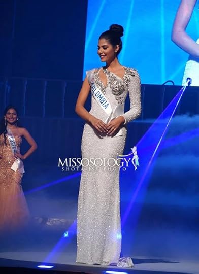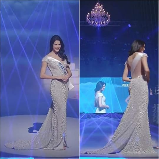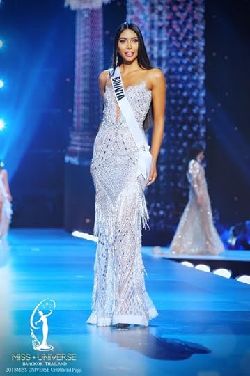 15. Miss Universe Venezuela Sthefany Gutierrez--Sthefany made her Evening Gown appearance at the Miss Universe 2018 Preliminaries in a silver-nude gown from Venezuelan designer Nihal Nouaihed . The fitted dress which featured long sleeves, had beautiful silver sequins in a "fireworks"-like display over a nude illusion base. It was simple, and gave an almost Retro-like air of Cher and Bob Mackie, especially with her long straight hair. I just wished she would have worn no-platform strappy silver heels instead.