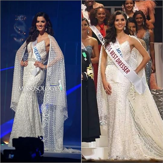 3. Miss Mexico International Nebai Torres--Nebai won the title of "Best Dresser" and with her evening gown choice, she proved why. Miss Mexico International also wore an ivory colored sequined gown, this one featuring heavily beaded lace, a fit-and-flare shape and dramatic back cape. She was giving you lots of Gown Drama, but in a sweet Miss International way (the Japanese-based beauty pageant loves its winners and contestants to be--let's just say--"sweeter". Not your typical va-va-voom pageant style. This design achieved all of that...and more!