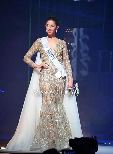 6. Miss Egypt International Farah Sedky--OH MY GOD...it's NOT IVORY! OK, kind of, but mostly gold...and ivory! This golden sequined-and-sheer gown worn by Egypt's Farah Sedky, made my No. 6 spot. The dress had a fit-and-flare "Mermaid Lite" shape, fit her beautifully and featured long sleeves, a v-neckline and very full back cape. It was dramatic, stage-impacting and looked expensive!