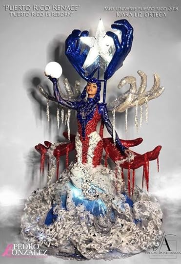 3. Miss Universe Puerto Rico Kiara Liz Ortega--Kiara Liz Otiga showed off her National Costume for the island U.S. territory of Puerto Rico entitled "Puerto Rican Reborn". Designed by Joshuan Aponte , the costume was inspired by Hurricane Maria. This "Fashion Hurricane" was made with multiple layers of different types of materials in transparent and metal finishes, including a layer of smart LED lights to represent the wind gusts movement. The Puerto Rican flag is shown in gems and crystals emanating from the eye of the hurricane. A combination of hands, all in different colors to represent the diversity of people in Puerto Rico while the rubies emanating from red hands represents the blood of more than 3,000 lives that were lost. White hands shower a rainfall of silver crystals that represent the tears of the village and in the diaspora. This costume wants to show that Puerto Rico is rising again and a metaphor of light that illuminates the path of queens and all women who decide to lift the homeland--Miss Universe 2018 National Costumes Presentation Show, Nong Nooch Tropical Garden, Pattaya, Thailand
