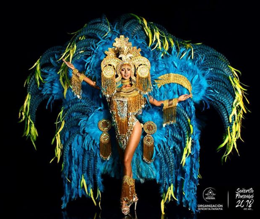 11. Miss Universe Panama Rosa Montezuma--The name behind this grand design for Miss Universe Panama is "Zarati, The Rebirth of Two Legends ". The costume features a tan-colored mesh base, to simulate Princess Zara under the gold of the sun's rays, which is made of more than 3,500 golden beads with small iridescent crystals and sheets of silver acetates, matching a bib, cuff links and anklets. The design was done by Abdul Juliao . The headdress and gear are inspired by the symbol of the eagle in the pre-Columbian era. The silver crown that is part of the headdress is plated in 18K gold and made by the hands of the goldsmiths Mila Jewelry--Miss Universe 2018 National Costumes Presentation Show, Nong Nooch Tropical Garden, Pattaya, Thailand