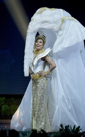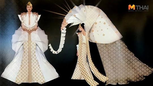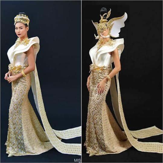 4. Miss Universe Thailand Sophida Kanchanarin--Entitled “Chang the Icon of Siam”, this elegant costume was designed by Tee Phasux. The 20-kilogram costume was decorated with Swarovski crystals and is a combination of Thai dress and technology using hydraulics to transform the dress into an elephant, hence the name “Chang the Icon of Siam”. The gorgeous ensemble also features ivory colored silk-wool double-layered torso/neckline details, intricate gold and pearl sequin embroidery, crown and back cape/flaps--Miss Universe 2018 National Costumes Presentation Show, Nong Nooch Tropical Garden, Pattaya, Thailand