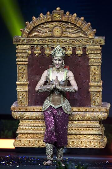 5. Miss Universe India Nehal Chudasama--Nehal chose to dress up like Bollywood actress Rani Rudrama Devi in the Telugu film "The Warrior Queen" (above photo) for her National Costume. Designed by Neeta Lulla and Melvyn Dominic Noronha, the costume weighs 105 pounds and includes her own throne (therefore the weight!), an embellished leather bustier, sequined purple "Harem" pants and a golden crown. It represents a warrior princess symbolizing women empowerment and diversity--Miss Universe 2018 National Costumes Presentation Show, Nong Nooch Tropical Garden, Pattaya, Thailand
