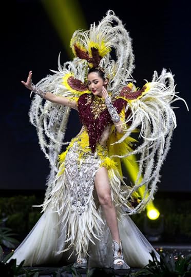 19. Miss Universe Indonesia Sonia Fergina Citra--Sonia wore this Indonesia National Costume entitled "The Bird of Paradise". Designed and created by Jember Fashion Carnaval , the look features gorgeous white and canary yellow feathers, silver sequins, ivory tulle, burgundy bead work and...birds that "come alive" in the back (Watch the video at the end of this BLOG to see!)--Miss Universe 2018 National Costumes Presentation Show, Nong Nooch Tropical Garden, Pattaya, Thailand