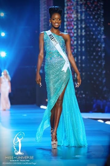 12. Miss Universe Nigeria Aramide Lopez--Aramide sauntered down the Miss Universe runway stage during the Preliminaries Evening Gown Competition looking every inch a Top Model in this blue jewel colored shimmering gown. The one shoulder, side-draped design showed off her lean and 6' 1" physique beautifully! I didn't even hate those strappy platform pumps: She worked them as if the rent was due darlings!