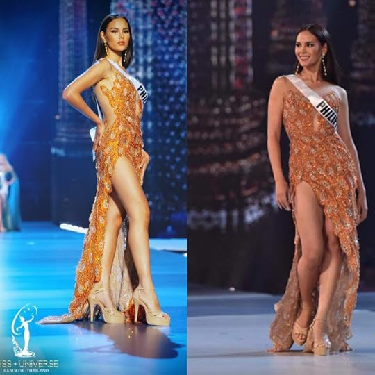 19. Miss Universe Philippines Catriona Gray--Catriona wore a golden design by Filipino designer Mak Tumang . The dress is inspired by the Ibong Adrana, a mythological bird/Phoenix that could change into different guises or characters, regenerating itself amidst a spectacle of flames: A phoenix rising from the ashes, as it were. The design featured feather-like sequined appliques set over a nude-colored tulle/chiffon base, fitted silhouette and front leg opening/slit. The color and bead work were great, but I just wished it wasn't as open in the front (it was too-mucheyyy-open for my taste), and here we go again with those clunky nude platforms!