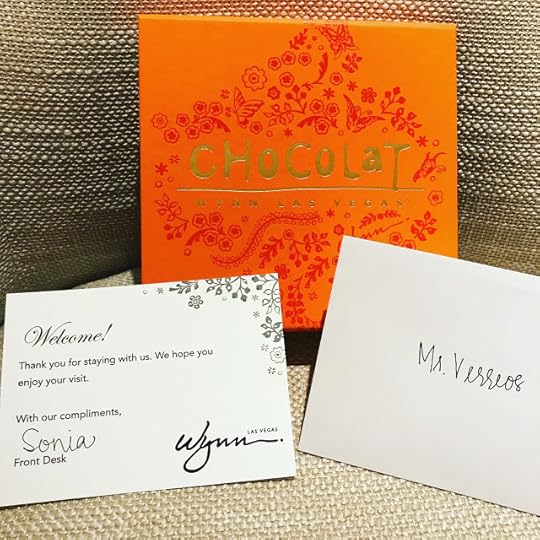 Goodnight Las Vegas--When I finished my hosting duties of the ICSC 2018 Global Awards, I headed back to my room and found this box of chocolates with a lovely note from Sonia--the Front Desk--Wynn Las Vegas. Classy. And very nice. Made my night. Thank you Sonia. Thank you Wynn Las Vegas XOXO