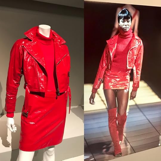 Rock & Roll Red--Versace Fall/Winter 1994/1995 Moto Jacket Suit and Michel Arnaud Photo of Naomi Campbell (in outfit) on the runway "Capturing the Catwalk: Runway Photography from the Michel Arnaud Archive" Exhibition FIDM Museum