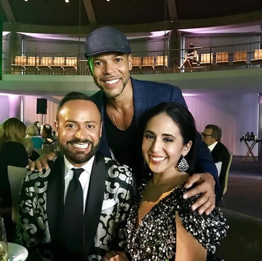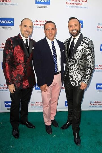 Designers & Muse--Designers David Paul and Nick Verreos of NIKOLAKI with actress Gabrielle Ruiz of "Crazy Ex Girlfriend" TV show, wearing sequined NIKOLAKI dress, attending The Actors Fund 22nd Annual Tony Awards Viewing Party, Skirball Cultural Center Los Angeles, California