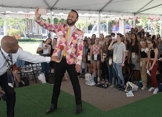 Let's Take a Selfie--Nick Verreos onstage taking a group selfie with attendees of FIDM Los Angeles "3 Days of Fashion" 2018
