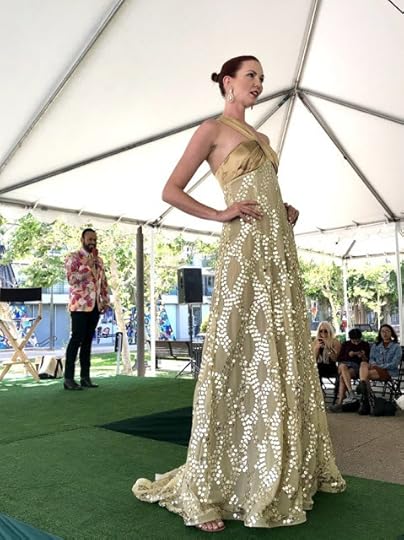 Golden Goddess--Model Amanda Fields Bennett wearing NIKOLAKI gold colored sequined silk chiffon gown with draped silk charmeuse top, as Nick Verreos introduces her--FIDM Los Angeles "3 Days of Fashion" 2018