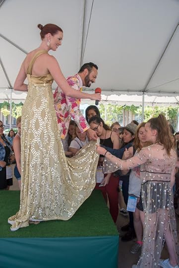 Center of Attention--Model Amanda Fields Bennett in NIKOLAKI gown as students check out the hem of the gown--FIDM San Diego "3 Days of Fashion" 2018