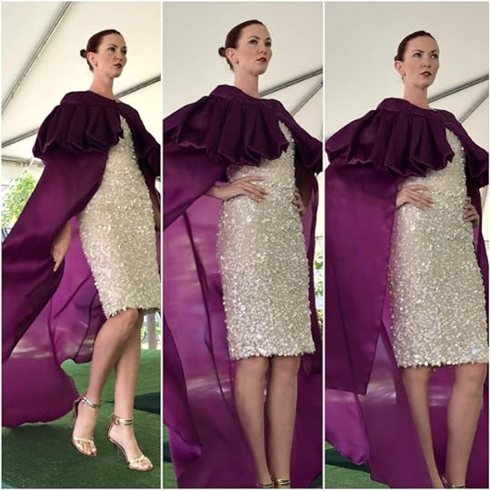 Cape Diva--Model Amanda Fields Bennett wearing NIKOLAKI ivory sequined cocktail dress and raspberry colored silk satin organza "Cardinal" Cape--FIDM Los Angeles "3 Days of Fashion" 2018