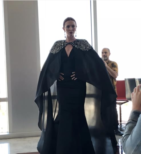 Caped Beauty--Model Amanda Fields Bennett wearing NIKOLAKI Black Silk Duchesse Gown and Black and sequined Silk Satin Organza Cape--FIDM San Diego "3 Days of Fashion" 2018 (with NIKOLAKI Co-Designer in the background taking a photo, lower photo)