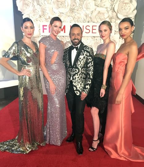 Gown Fabulous--Nick Verreos with models (L to R) Amber Lindauer, Amanda Fields Bennett, Brianna Barnes, Lily Taylor in NIKOLAKi gowns--KTLA "Live From The Oscars" 90 Years of Style TV Segment, FIDM Museum
