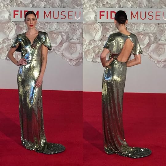 2018 Red Carpet Sparkle #2: Model Amber Lindauer in NIKOLAKI silk chiffon-backed gold sequined gown with capelet, cowl-draped neckline and open back--FIDM Museum