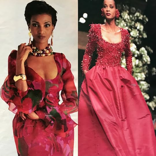 1980's Inspired Diva: Model Amanda Fields Bennett in NIKOLAKI raspberry colored silk ziberline mermaid-shaped gown--FIDM Museum