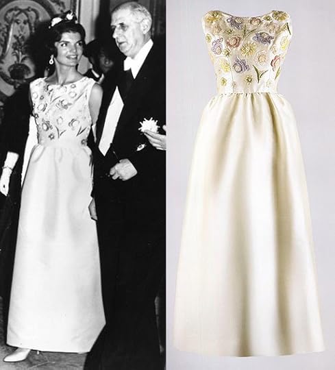 1961--U.S. First Lady Jacqueline Kennedy wore Givenchy Haute Couture (but kept it a secret since the U.S press might deem it "inappropriate" to be wearing a French designer as a U.S. First Lady) when she accompanied her husband, President Kennedy on a State Visit to France and charmed the country--as well as then-President of France Charles de Gaulle at a dinner in Versailles.