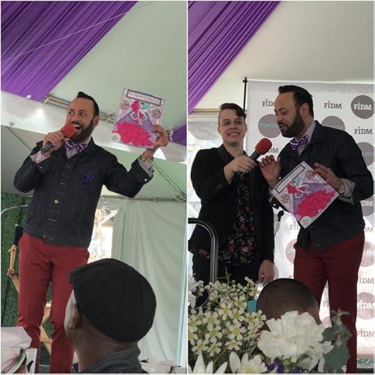 Pageant Coloring Book Prize--All the five ticket raffle winners got a wonderful bag filled with goodies including my "The Pageant Coloring Book"--Nick Verreos onstage at the FIDM Debut 2018 Educators Luncheon, Grand Hope Park FIDM L.A. Campus