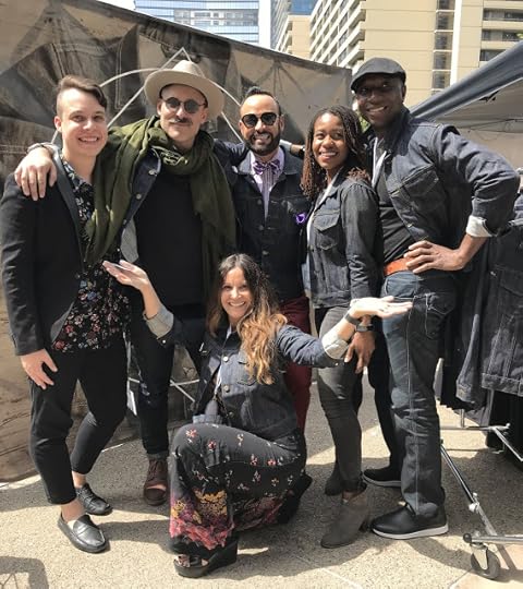 Nick Verreos with FIDM Special Events Coordinator Spencer Williams (far left), and the Skid Row Denim & Apparel crew (L to R) Brad Robinson, Lee Raagas (kneeling), Kisha Claude and Royden Vigilance--FIDM Debut 2018 Educators Day, Skid Row Denim & Apparel Pop Op Store, Grand Hope Park FIDM L.A. Campus