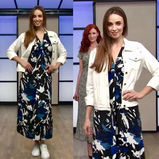 Model in "NV Nick Verreos" QVC UK Printed Knit Maxi Dress and White Studded "Denim" Jacket