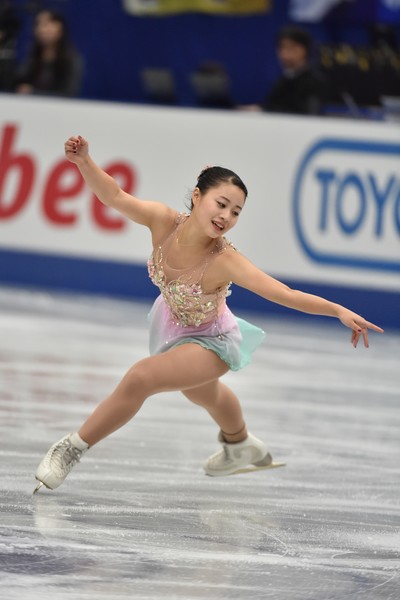 Yuna Shirawa of Japan: Yuna skated her Short Program to The Girl With Flaxen Hair by Claude Debussy in this pastel pretty costume. The design featured lilac, aquamarine and nude colors and beautiful flowers-and-leaves sequined embroidery on the upper torso.