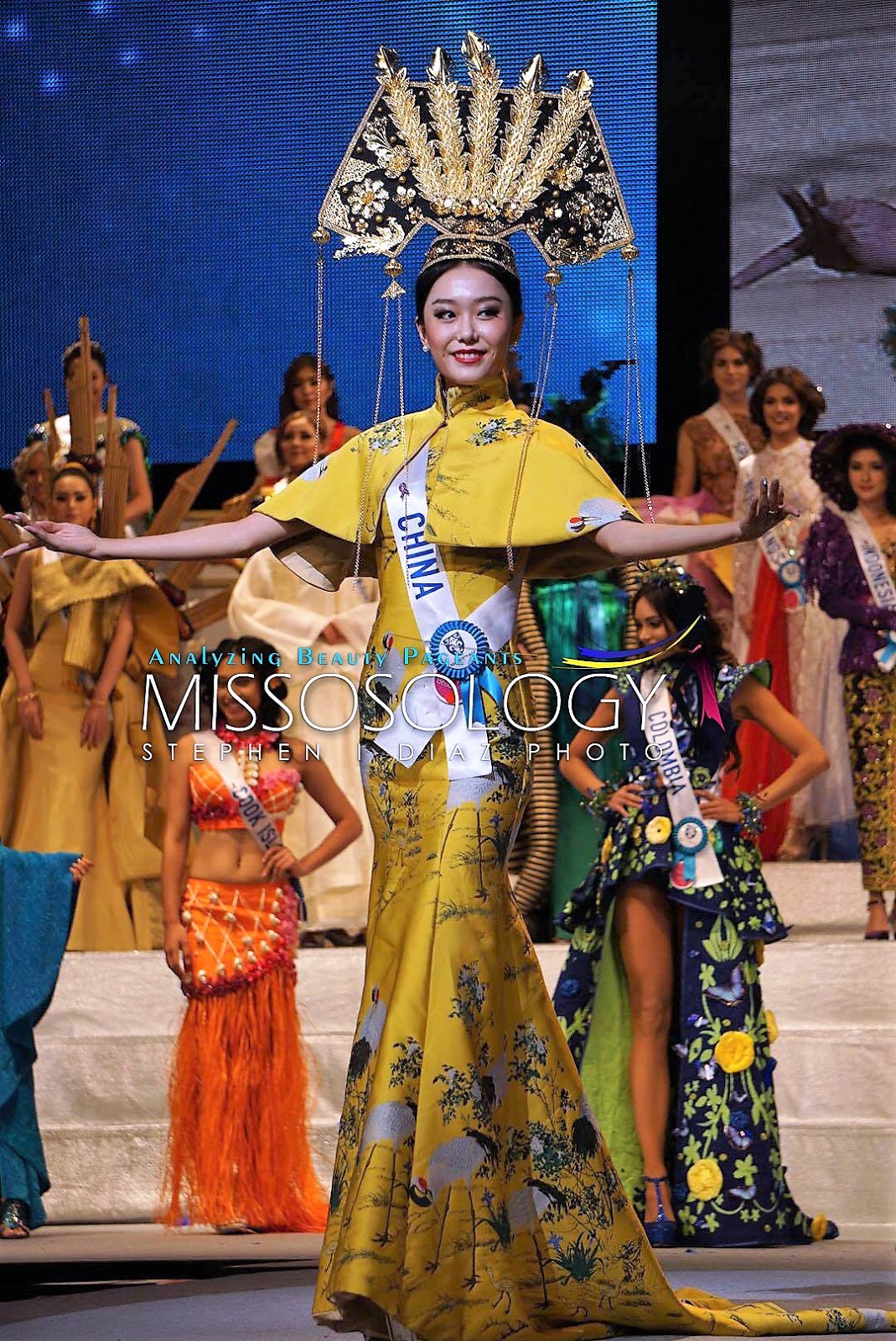 Miss International China Jia Chi: this yellow silk brocade costume was one of the BEST of all the Miss International 2017 contestants. The design featured a perfectly fitted fit-and-flare style gown with a Mandarin-collared caplet, both featuring beautiful birds and flower embroidery. This entire costume was topped off with an elegant gold headdress. It was chic, runway fab and if you just took off the headdress, this would be a stunning evening gown alone!