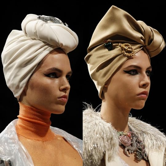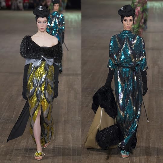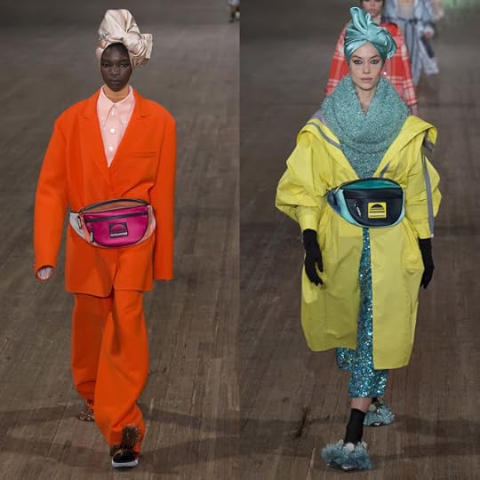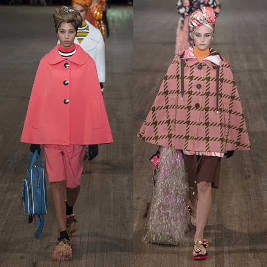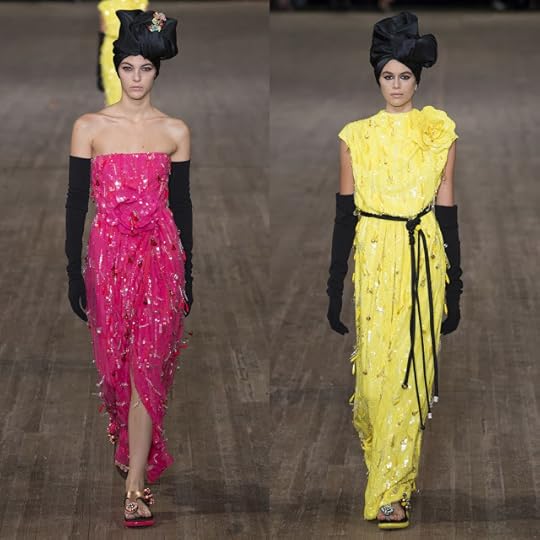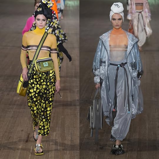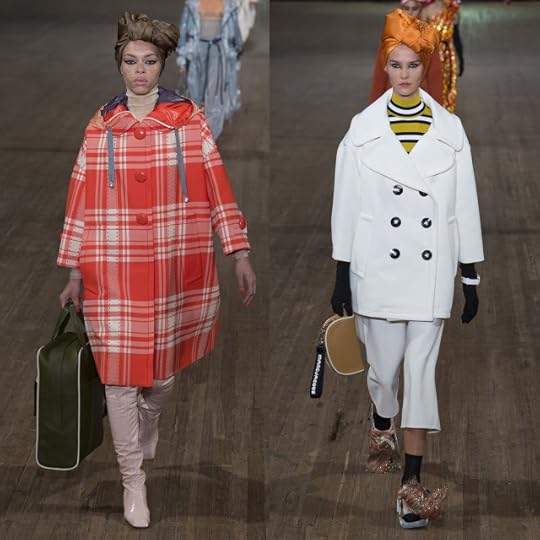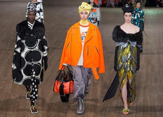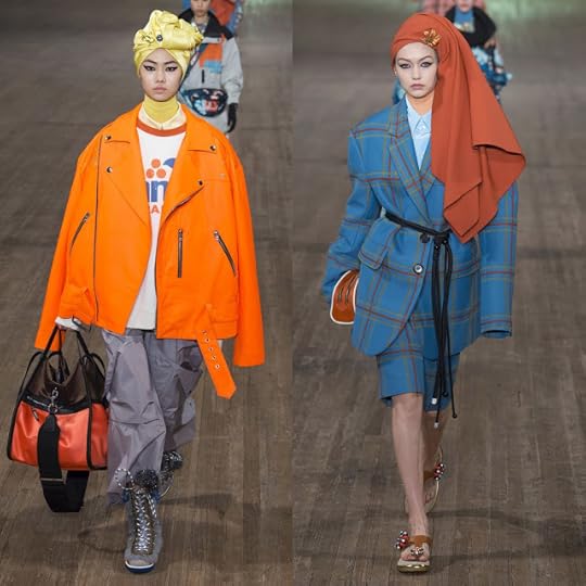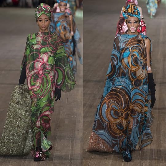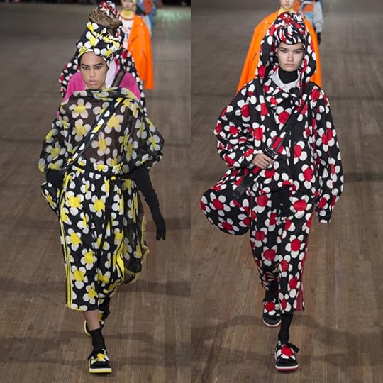 WHAT: Marc Jacobs Spring 2018. Jacobs' latest collection was (according to the program notes) "re-imagining of seasons past somewhere beyond the urban landscape of New York City". Maybe it was a look-back at past seasons in his collections and certainly, there was some Marc Jacobs style nostalgia on the runway including the turbans, oversized-wear, early 70's glamour; 80's Hip-hop; "Grey Gardens" style.