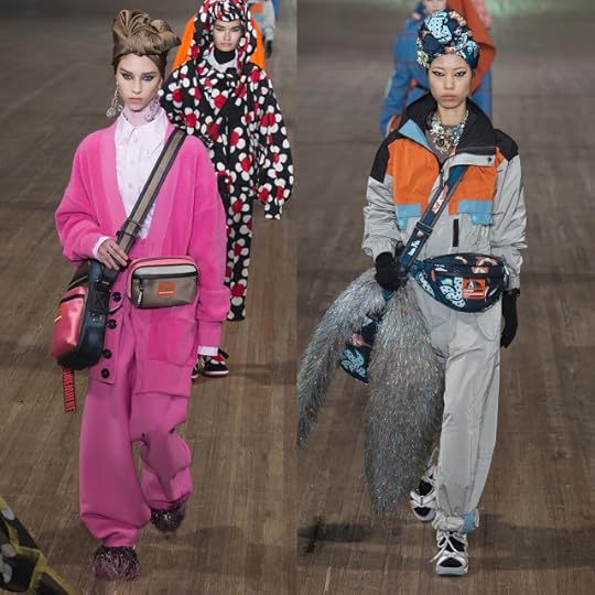 TRENDS: Oversized Jackets; Pajama-wear; Fanny-packs; Capes; Overalls; Bag-lady Chic; Late 60's/early 70's "Valley of the Dolls" Hollywood; Sequined Dresses, gowns.