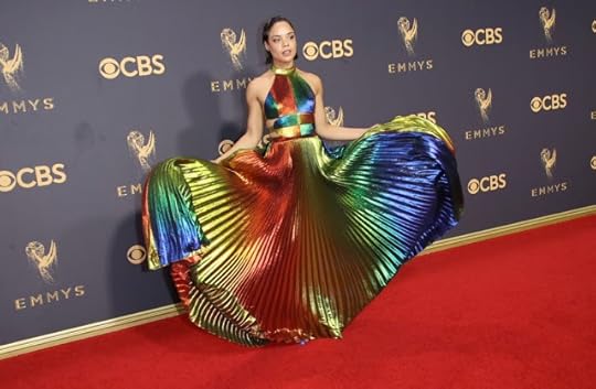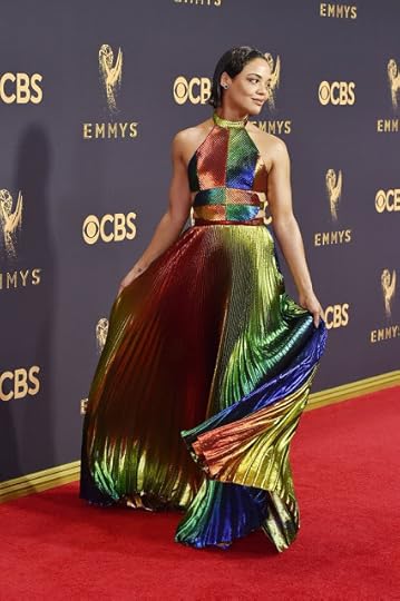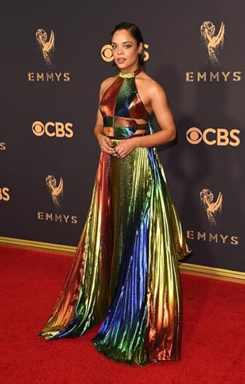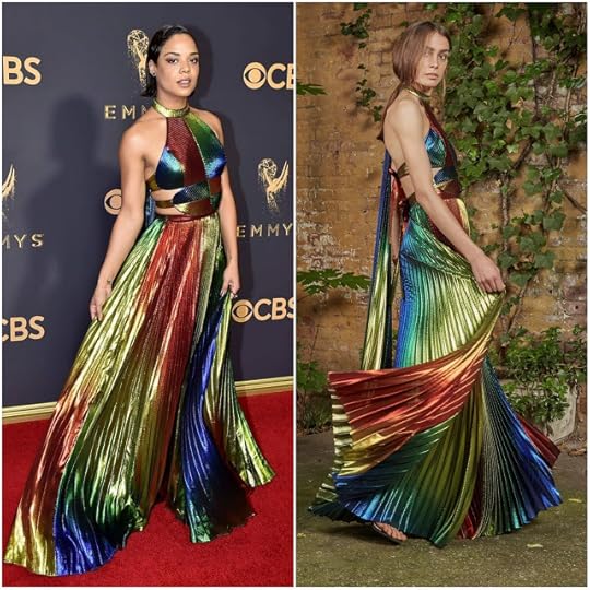 HBO's Westworld star Tessa Thompson wore this colorful gown from Brooklyn-born NYC-based designer Rosie Assoulin and her Resort 2018 collection. The halter-style fan-pleated dress was definitely something "different" and "unexpected" for a big awards show red carpet, especially one such as the 2017 Primetime Emmy Awards. This style I would expect more at Cannes, for example but definitely NOT the Emmys. For that, I applaud her! I love when actresses take chances and especially good ones. I am sure there may be some "fashion naysayers" out there---I can hear them right now saying "Oh my God Nick, this dress looks like she's in the cast of 'Joseph and  the Technicolor Dreamcoat"! ...