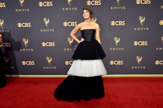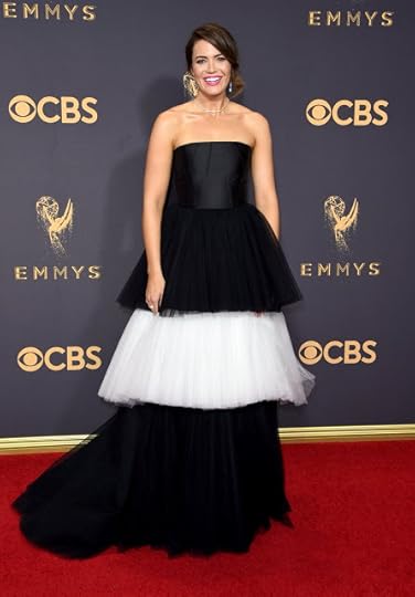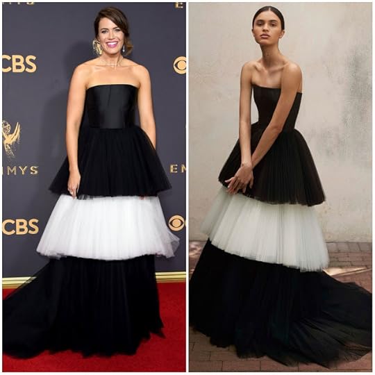 "This Is Us" star Mandy Moore starts my EMMYS 2017 RED CARPET blogging with this black and white gown from Carolina Herrera Resort 2018 collection. The strapless gown featured a three-tiered skirt section of fan-pleated tulle. I thought she looked quite elegant and pretty. I loved the fit of the bustier and how the tiers lengthened her already tall frame.