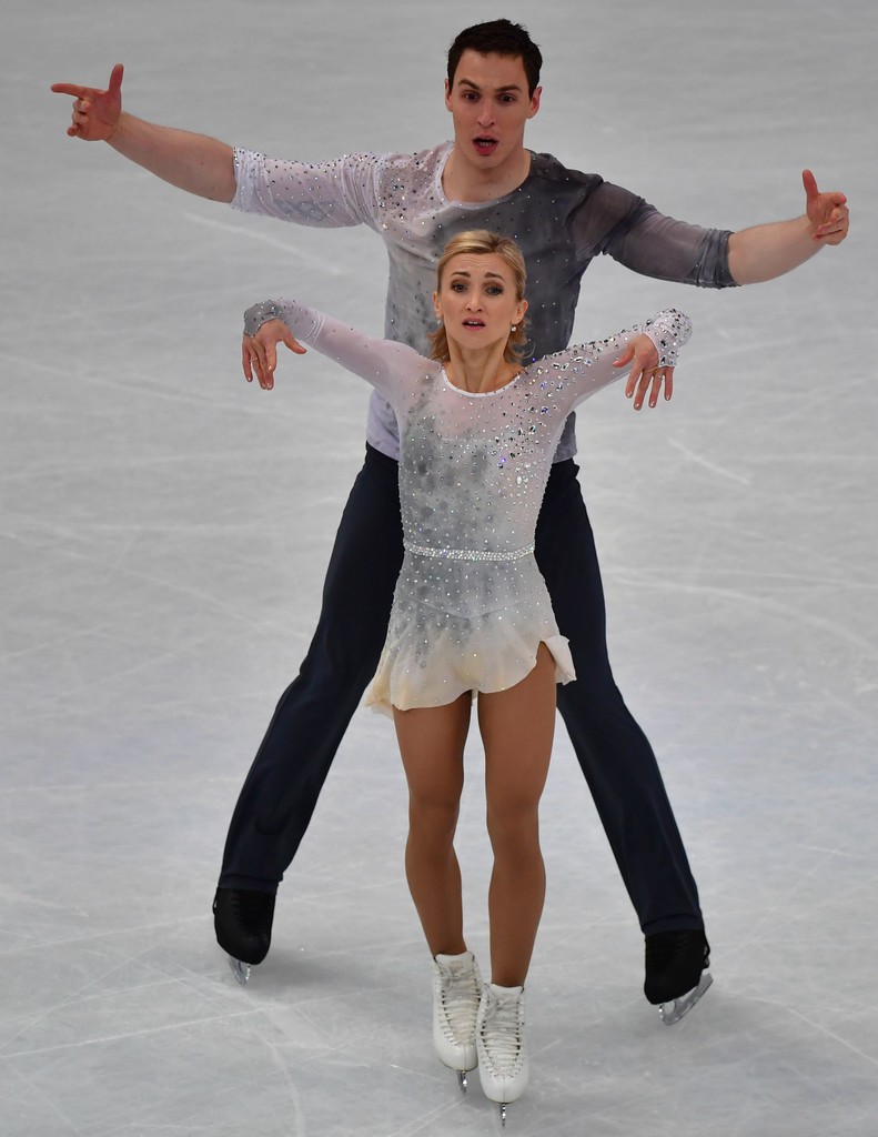 Vanessa James and Morgan Cipres France Short Program to Earned It (from "Fifty Shades of Grey") by The Weekend and Maxime Rodriguez: I always look forward to what James and Cipres wear. These two have the most AMAZING bodies and they almost always give fashion folk like me something when it comes to their costumes. For their Short Program this season, they went sexy, 90's Vintage Versace-like (especially with those back straps on James). I especially liked her black-and-nude illusion sequined trimmed top section as well as the crystal-accented shoulders of his Moto jacket. They both looked on-trend, fashionable and oh-so-chic!